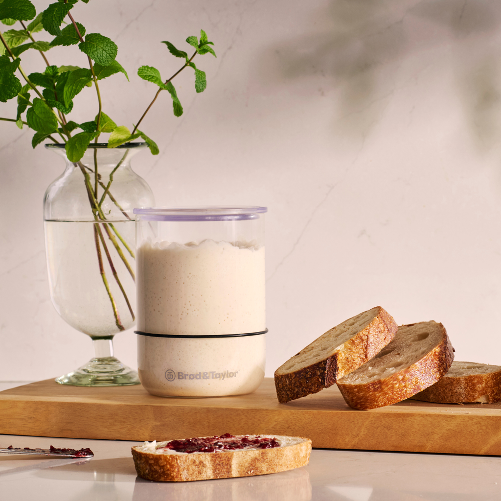 The loose fitting plastic lid allows your starter to breathe and regulate pressure. Perfectly sized to fit in the Brød & Taylor Sourdough Home.